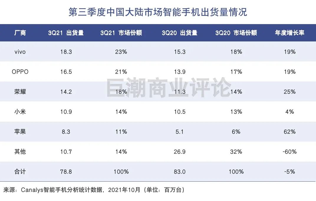 中國大陸第三季度智能手機出貨量前6的品牌中,小米手機的增速是最慢的,且第三的位置已經(jīng)被榮耀所占領(lǐng)。