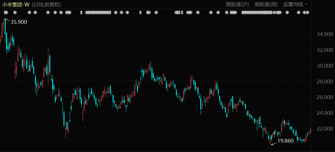 反映到資本市場表現(xiàn)上,雖然小米集團上半年業(yè)績亮眼且尚未披露三季報數(shù)據(jù),但其股價早有反應。自從2021年1月小米集團創(chuàng)下35.9港元/股高價以后,股價持續(xù)震蕩走低,截至目前小米集團較高點累計跌幅已經(jīng)超過40%,這還是在其不斷回購的情況下。