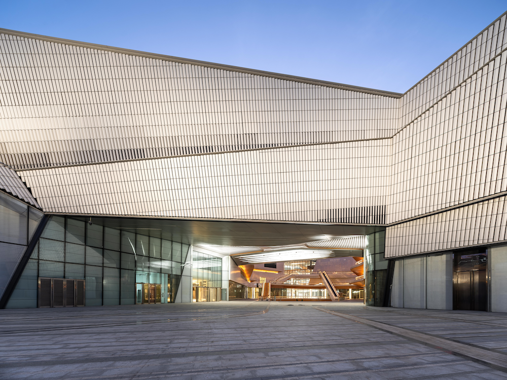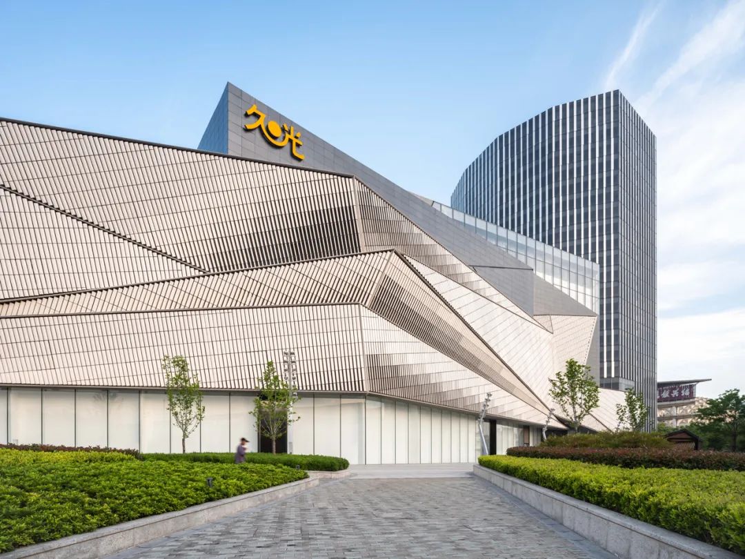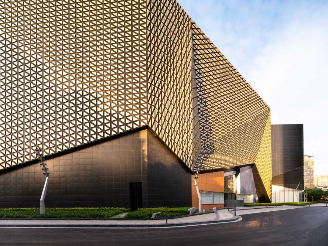 建筑外表看,切割后的三角形面兼容了現(xiàn)代的硬朗風格和東方折紙藝術(shù)的美感,看過去,金、黑、白三色的視覺呈現(xiàn)非常吸睛。