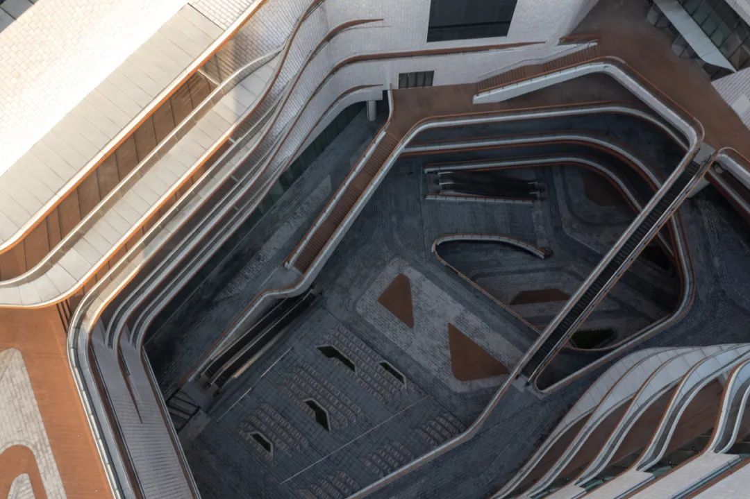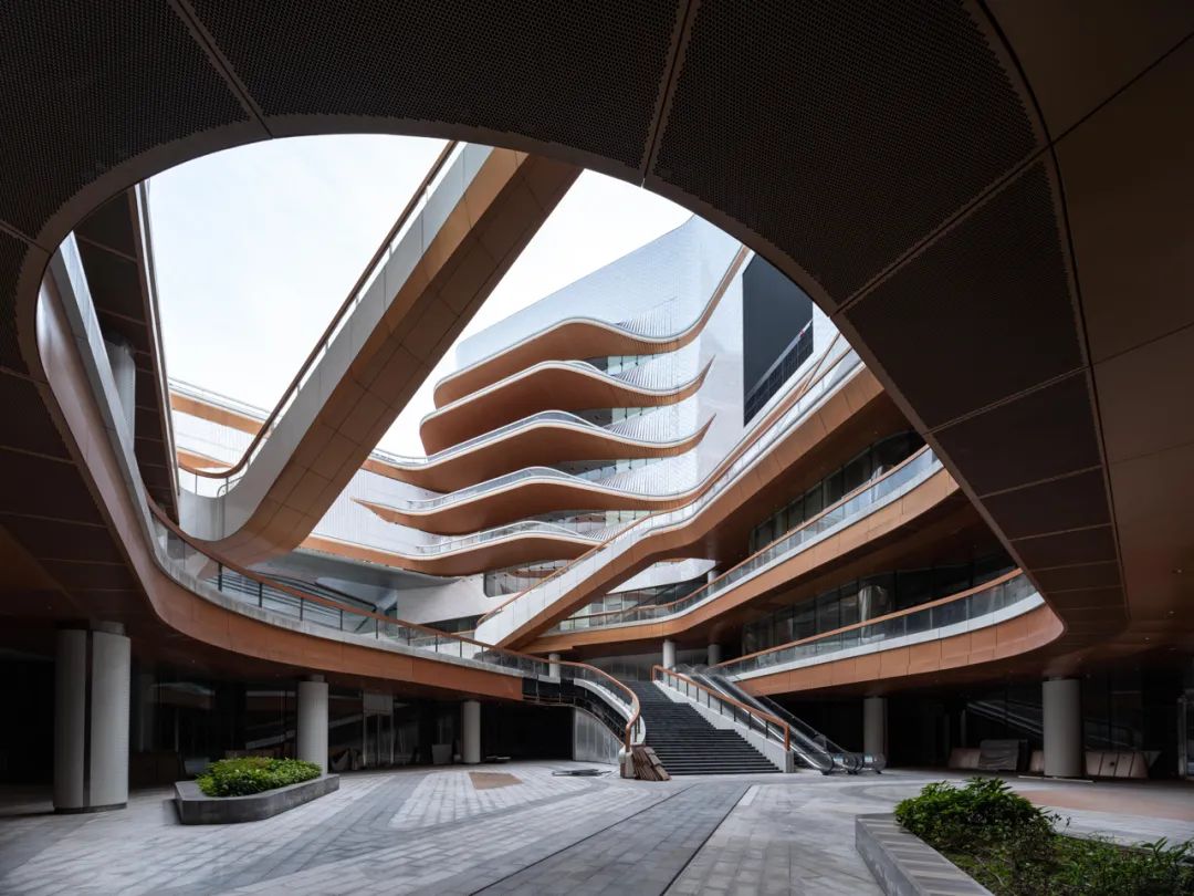 串聯(lián)空間內(nèi)外的環(huán)游動線和半室外多層次的空中回廊,環(huán)環(huán)相扣,相當于潺潺的溪流,在引導人流的同時,讓空間的層次感和趣味性變得更強了。且商場與下沉式廣場、戶外平臺、屋頂花園乃至辦公樓都有很便捷的通道。
