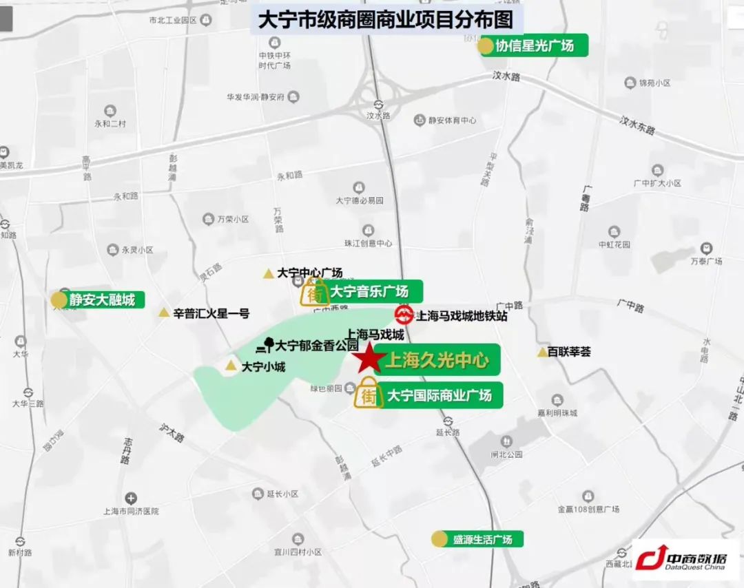 此外,大寧商圈雖以大寧國際商業(yè)廣場展開,但北有協(xié)信星光廣場,西有靜安大融城,南有盛源廣場,東有新開業(yè)的百聯(lián)莘薈,但彼此距離都不近,可謂大而泛的無中心狀態(tài)。
