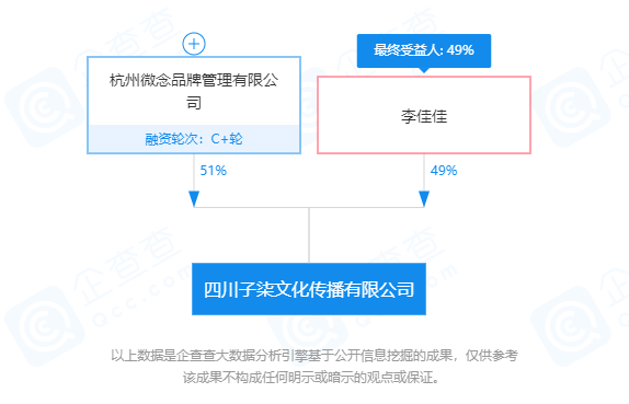 2017年7月20日,李佳佳與杭州微念聯(lián)合成立了四川子柒文化傳播有限公司,據(jù)企查查數(shù)據(jù)顯示,從股權(quán)結(jié)構(gòu)來(lái)看,微念占據(jù)51%,李佳佳個(gè)人占據(jù)49%。與此同時(shí),李佳佳就將“李子柒”這個(gè)品牌授權(quán)給了杭州微念。