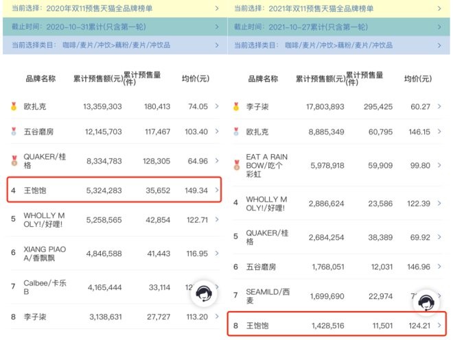 不過,品牌們的戰(zhàn)報(bào)除了實(shí)打?qū)嵉脑鲩L,也有玄機(jī)暗藏的。比如,王飽飽的戰(zhàn)報(bào)——“雙十一期間,天貓沖飲麥片品類銷量TOP1,單鏈接銷售破100萬包”;再看其618戰(zhàn)績——“旗下商品入選天貓榜單’麥片V榜’”,更值得玩味。而王飽飽的競爭對手歐扎克也在戰(zhàn)報(bào)上說自己是沖飲麥片品類第一,但強(qiáng)調(diào)是2021全年,截至11月11日,并非單指雙十一。