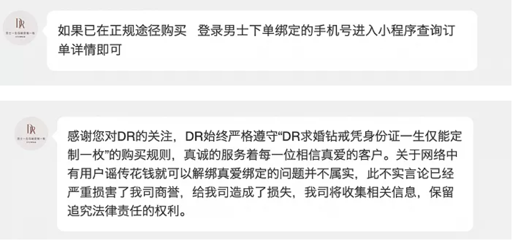 甚至還有網(wǎng)友爆料稱,DR鉆戒宣稱“男士一生僅能定制一枚”,其實花500元就可以消除購買記錄,但客服稱這并不屬實。