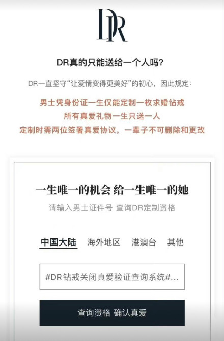 而用戶在購買的過程當中也是儀式感拉滿:男士購買結(jié)婚鉆戒需要跟身份證綁定,雙方還需要簽訂真愛協(xié)議,擁有屬于兩個人的真愛編碼,并做出此生真愛不變的承諾。此外DR鉆戒還推出了真愛驗證查詢系統(tǒng),可以用身份證查詢用戶的購買和綁定記錄,如果有過購買行為的用戶,DR鉆戒將拒絕向該用戶銷售結(jié)婚鉆戒。