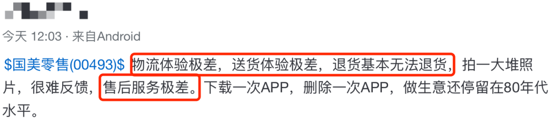 “買國美股票前,最好下載真快樂APP使用,使用體驗五次后,你們絕對會賣出國美零售股票。這還是個(上世紀)80年代思維的零售企業(yè),與京東、天貓、拼多多等企業(yè)差距太大!边@是一位雪球用戶對國美的評價。
