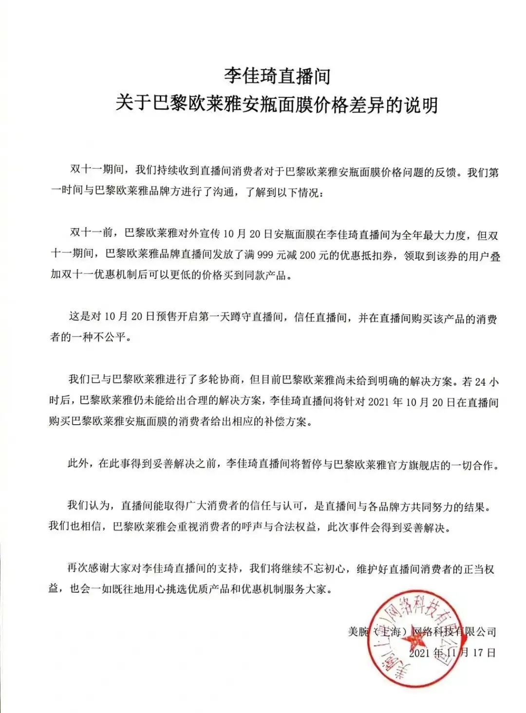 11月17日晚8時許,李佳琦公司美腕(主海)網(wǎng)絡(luò)科技有限公司發(fā)布聲明表示,已與巴黎歐萊雅進(jìn)行了多輪協(xié)商,但目前巴黎歐萊雅尚未給到明確的解決方案。若24小時后,巴黎歐萊雅仍未能給出合理的解決方案,李佳琦直播間將針對2021年10月20日在直播間購買巴黎歐萊雅安瓶面膜的消費者給出相應(yīng)的補(bǔ)償方案。美腕相關(guān)負(fù)責(zé)人表示:“我們會全面兜底”。在此事得到妥善解決之前,李佳琦直播間將暫停與巴黎歐萊雅官方旗艦店的一切合作。