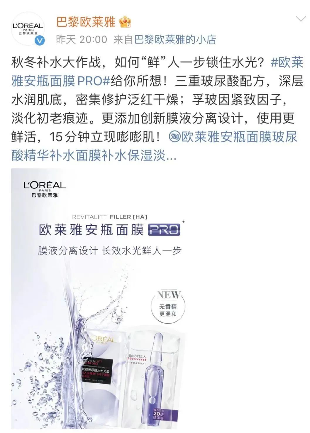 更奇葩的是,就在上熱搜當(dāng)晚,巴黎歐萊雅官方微博還發(fā)了一條安瓶面膜的宣傳廣告。
