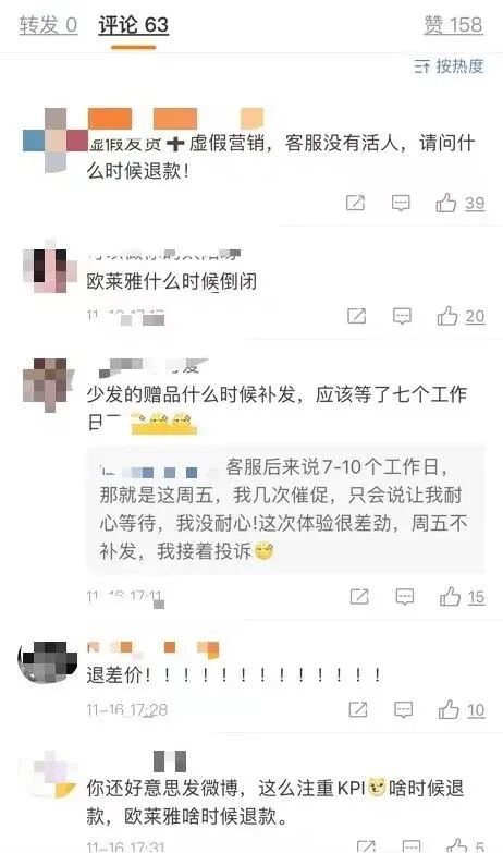 眾多消費者要求歐萊雅退差價,也有消費者表示,支付尾款后,歐萊雅旗艦店一直未按承諾時間發(fā)貨,已經(jīng)長達(dá)半月,為了維權(quán),消費者對歐萊雅發(fā)起了集體投訴。
