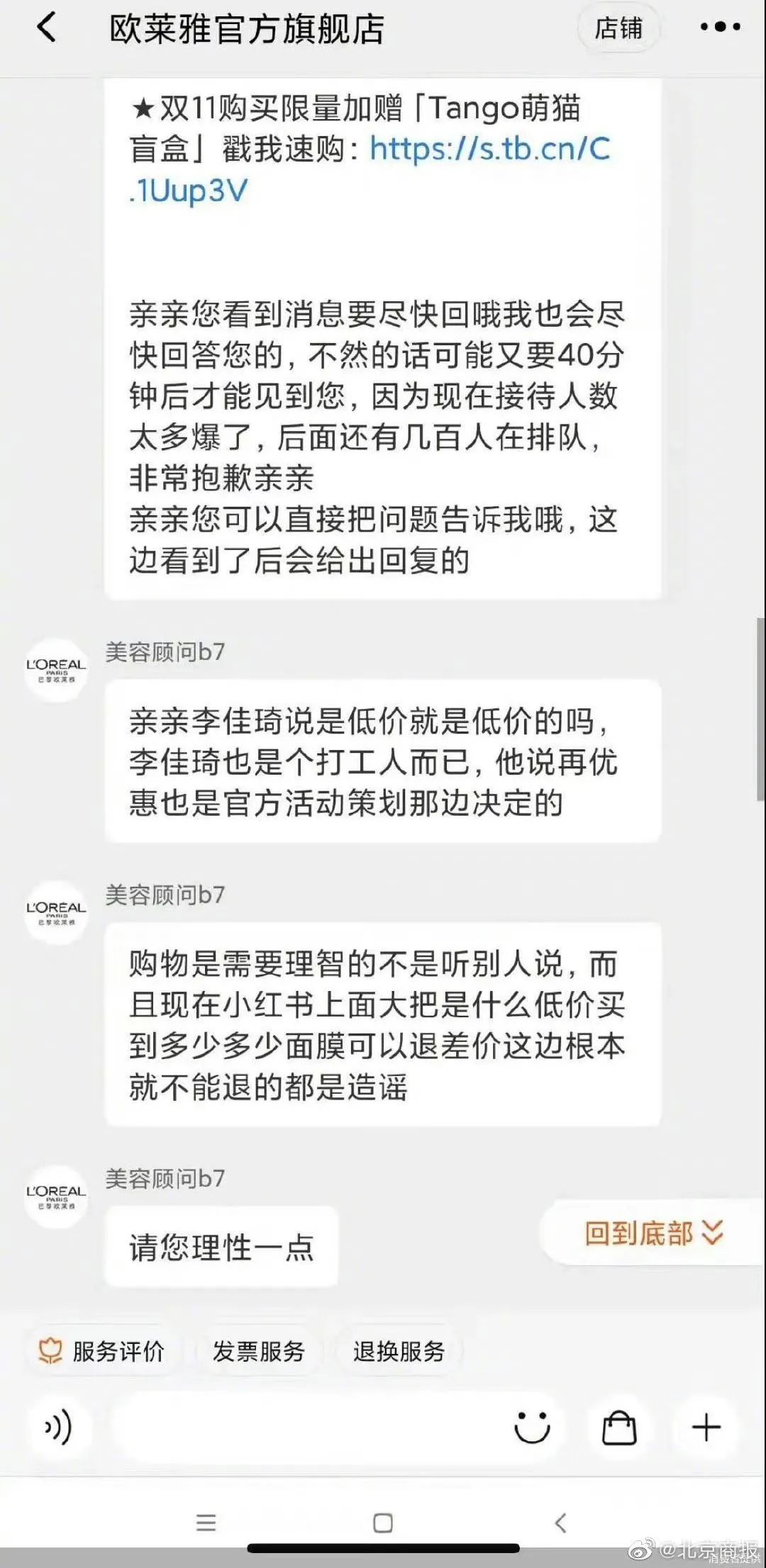 還有網(wǎng)友直接跑到歐萊雅旗艦店質(zhì)問客服如何退差價?头幕貞(yīng)是,差價是因不定期推出促銷活動導(dǎo)致的,不同活動的價格會有所變動。要退差價,需要提供優(yōu)惠券錄屏進(jìn)行核實。