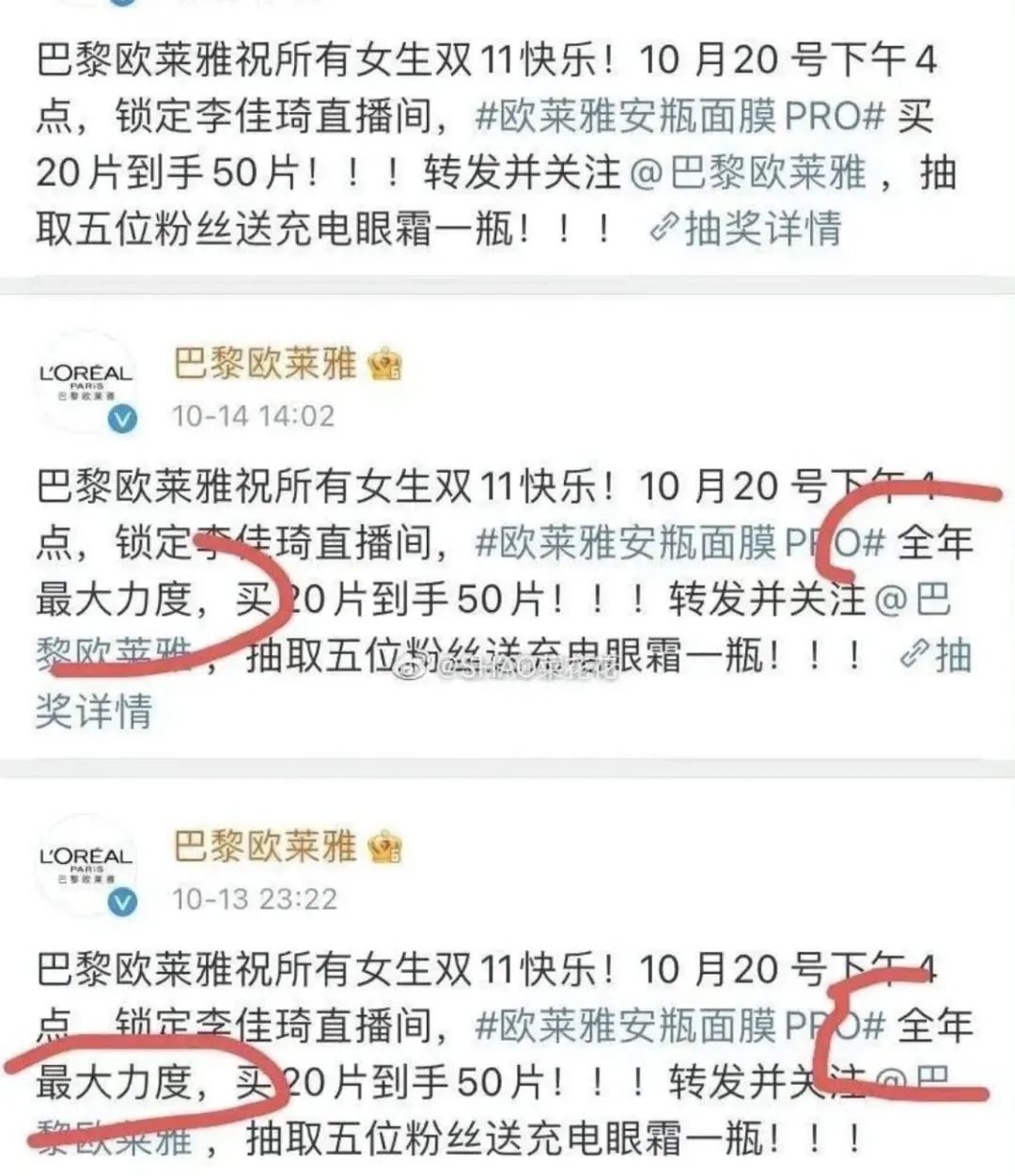 有網(wǎng)友貼圖證明,巴黎歐萊雅在10月13日、14日兩天接連在官方微博上發(fā)布李佳琦的直播預(yù)告,強(qiáng)調(diào)直播間安瓶面膜將會是“全年最大力度”。但事件出來后,巴黎歐萊雅微博將“全年最大力度”的說法刪除。