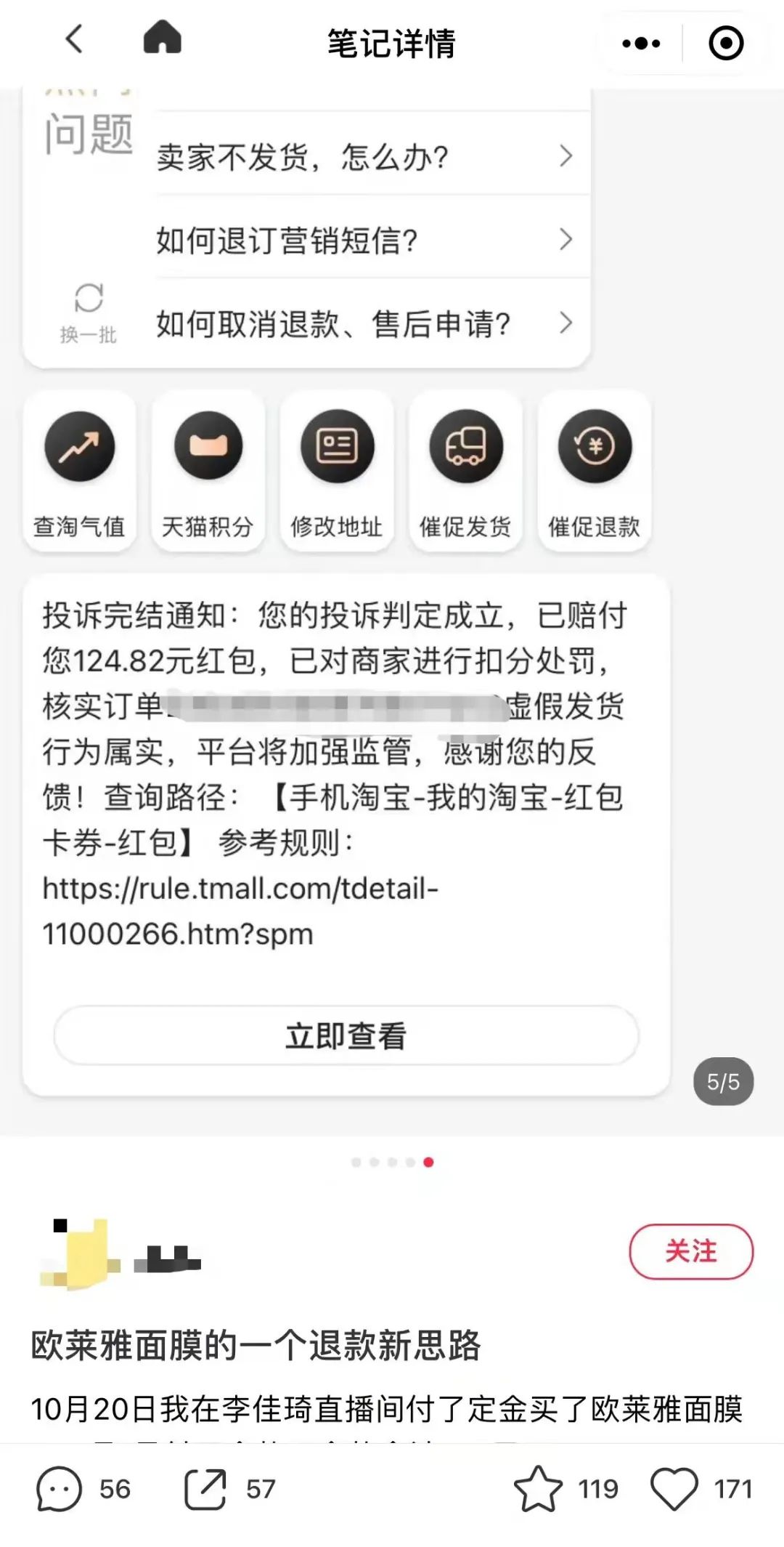 小紅書(shū)用戶曬出平臺(tái)支持判罰歐萊雅虛假發(fā)貨的截圖