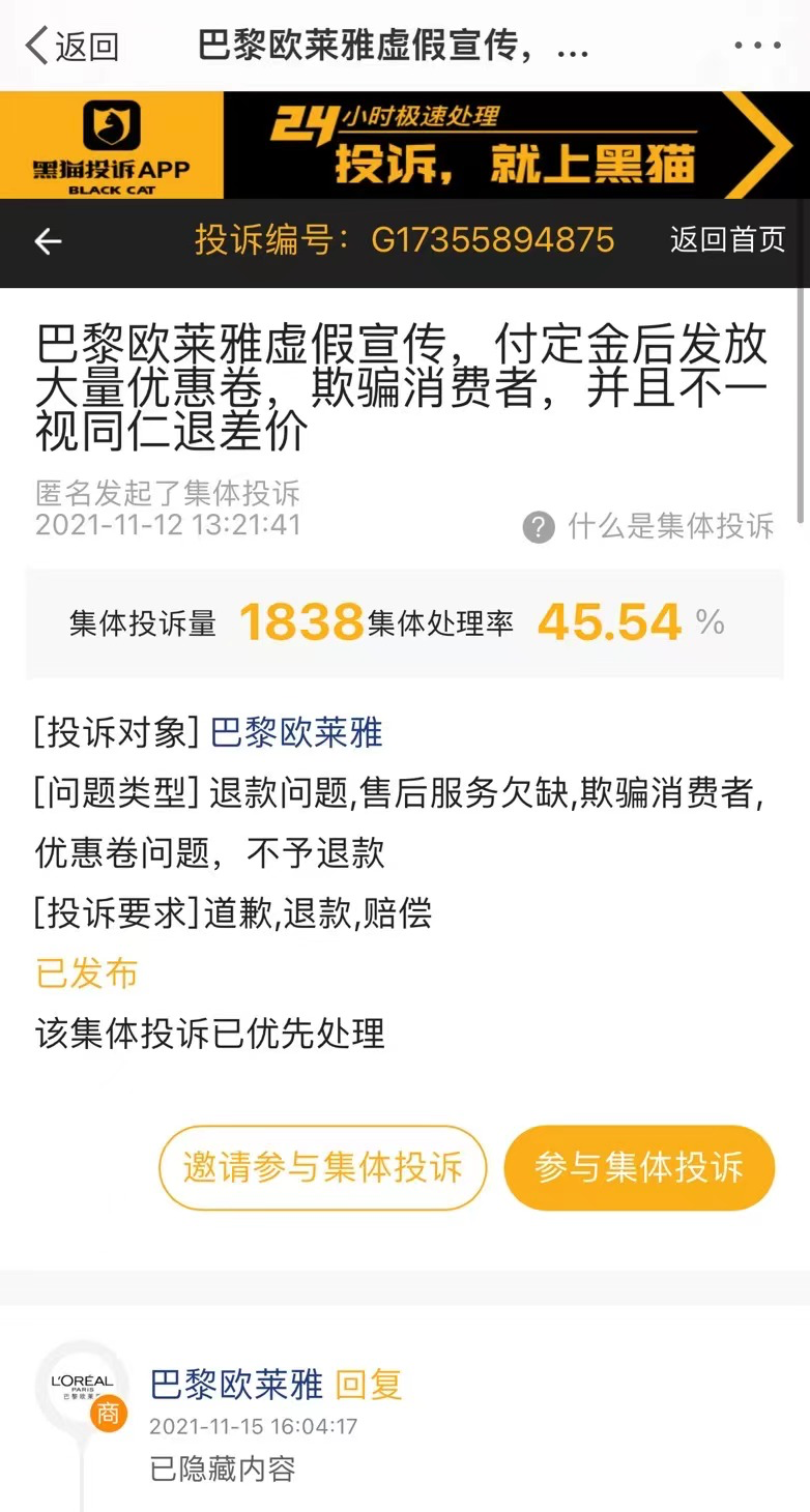 目前黑貓投訴上歐萊雅該事件的集體訴訟已有超過(guò)1800人參與,相關(guān)話題在小紅書(shū)、微博、抖音均已沖上熱搜。