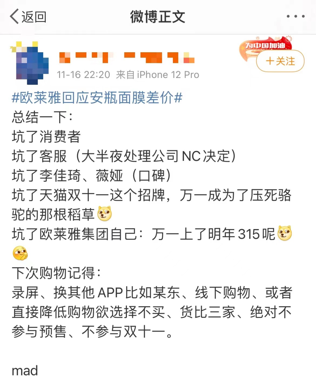 當(dāng)然上述都只是我們的猜測(cè),也可能歐萊雅根本沒(méi)有這么深的想法,只是店鋪運(yùn)營(yíng)單純地想在雙十一沖一把自播直播間的銷售排名,瞎發(fā)了一波優(yōu)惠券,F(xiàn)在事情捅大了,60萬(wàn)預(yù)售訂單要都按這個(gè)退差價(jià),再算上給主播的傭金,實(shí)在賠不起只好硬扛。