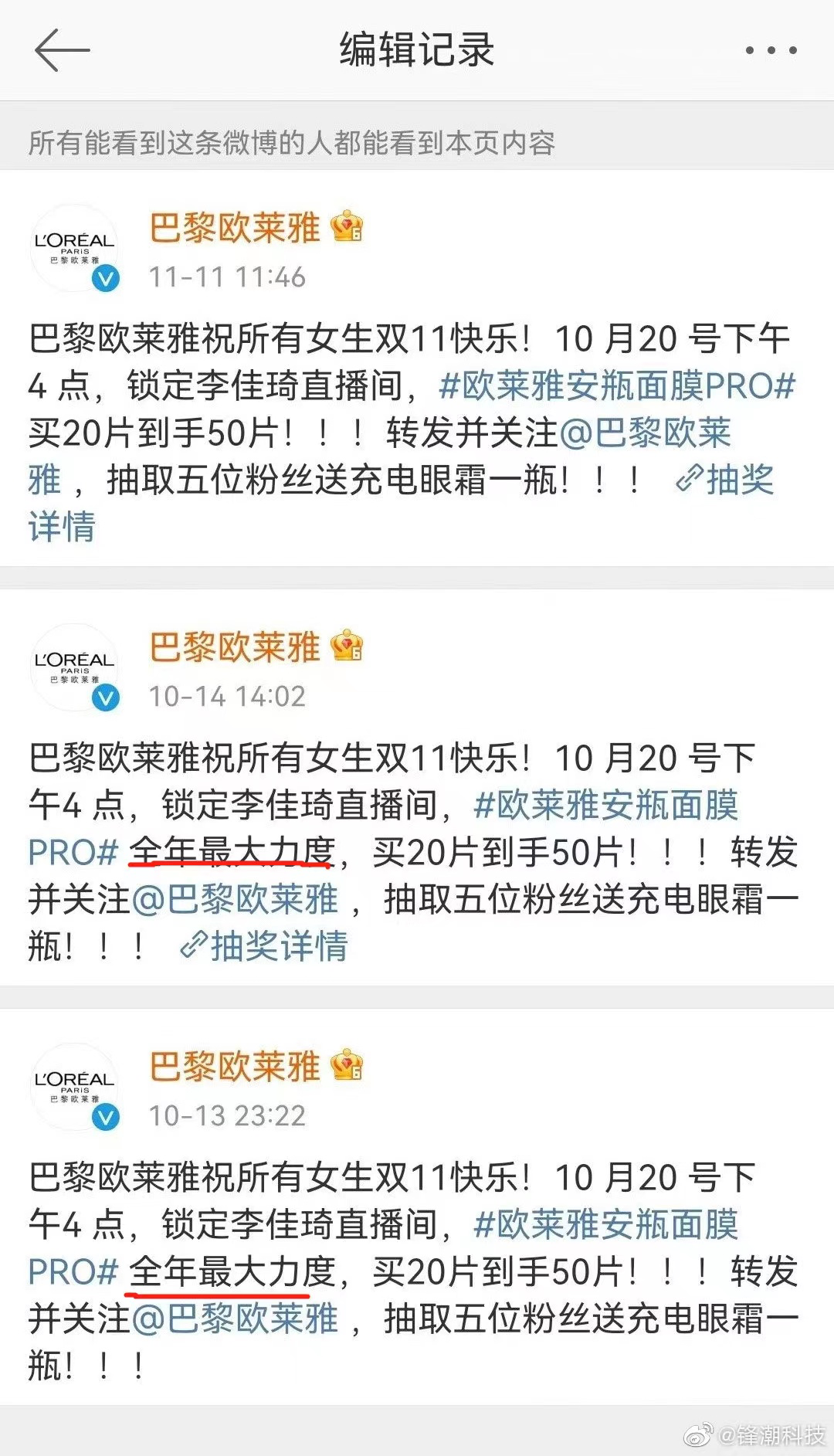 熱搜爆出后,歐萊雅官微修改了此前為李佳琦直播間預(yù)售發(fā)的微博,刪除了“全年最大力度”的關(guān)鍵字眼。