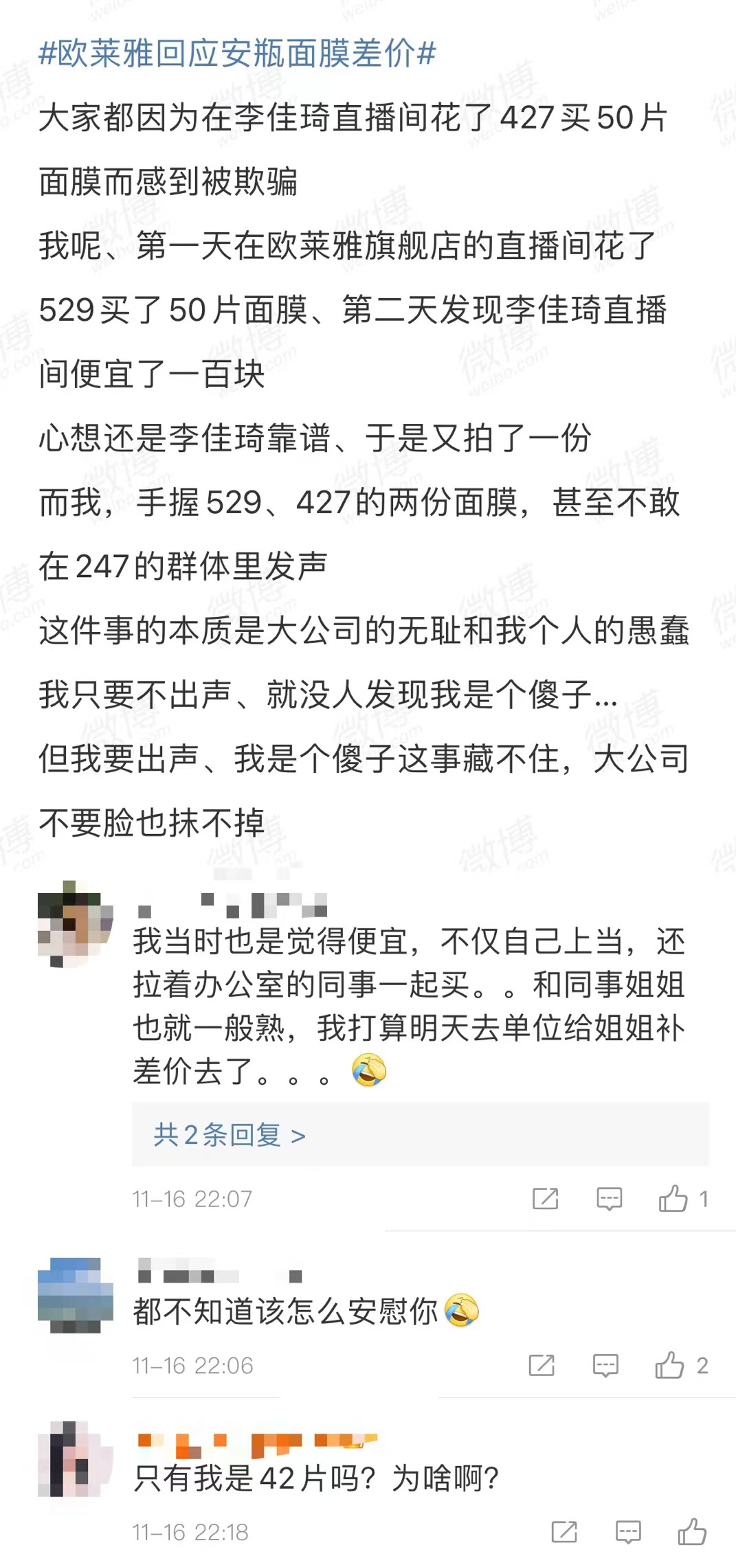 這件事最匪夷所思的地方在于,歐萊雅跟薇婭李佳琦這樣的頭部主播合作都堅(jiān)持住了不破價(jià),429的預(yù)售價(jià)跟旗艦店的官方價(jià)一模一樣,只是主播在原來(lái)20片的基礎(chǔ)上“爭(zhēng)取”到了更多贈(zèng)品,承諾最終到手是50片。