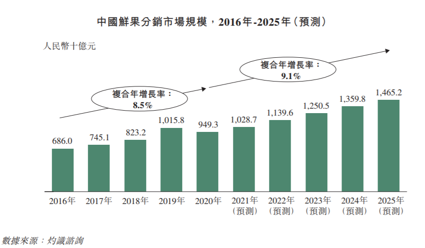按銷售收入測算,中國鮮果分銷市場規(guī)模已經(jīng)由2016年6860億元增長至2020年9493億元,復(fù)合年增長率為8.5%。未來,中國鮮果分銷市場規(guī)模預(yù)計于2020年-2025年以復(fù)合年增長率9.1%進一步增長,于2025年達到14,652億元。