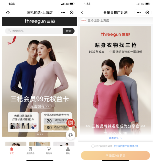 據(jù)了解,有贊新零售將全面參與到三槍集團(tuán)數(shù)字化的每一個(gè)環(huán)節(jié)中。首先,三槍集團(tuán)將全面接入有贊新零售的導(dǎo)購助手、企業(yè)微信助手、有贊CRM及有贊連鎖微商城的“四件套”產(chǎn)品,建立起私域經(jīng)營的陣地。