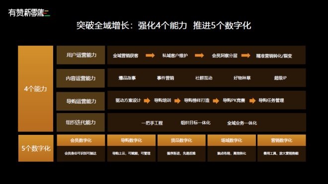 針對百購行業(yè)的現(xiàn)狀,有贊提出了“強化4個能力、推進5個數(shù)字化的解決方案”!八膫能力包括用戶運營能力、內(nèi)容運營能力、導(dǎo)購運營能力和組織迭代能力四個方面;5個數(shù)字化則是指會員、導(dǎo)購、貨品、場域及營銷的數(shù)字化建設(shè)”。