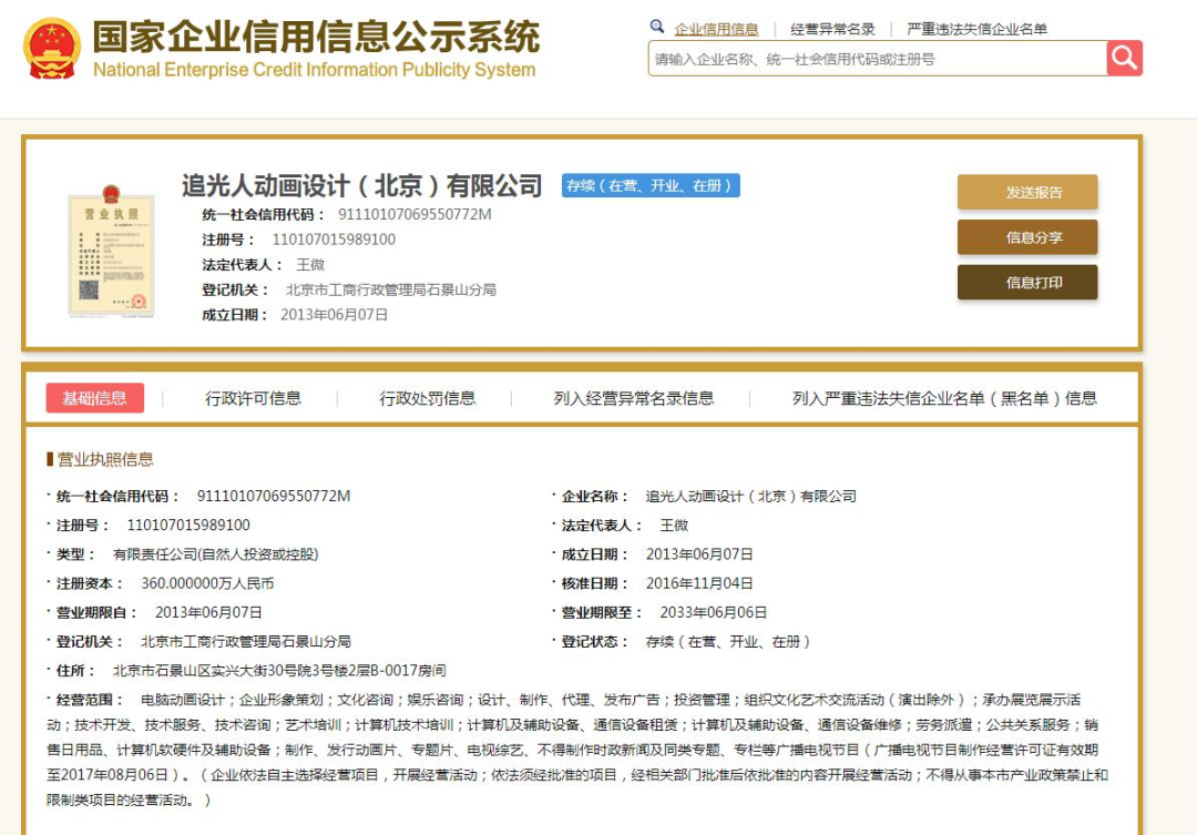 值得一提的是,花西子發(fā)布上述微博時(shí)還@了微博賬號(hào)“王微”“直線穿越”和“—TEAM JOY—”。其中,“王微”和“直線穿越”的微博認(rèn)證分別為追光動(dòng)畫的創(chuàng)始人和聯(lián)合創(chuàng)始人。追光動(dòng)畫母公司即為追光人動(dòng)畫設(shè)計(jì)(北京)有限公司,根據(jù)國(guó)家企業(yè)信用信息公示系統(tǒng)信息,該公司成立于2013年6月7日,公司法定代表人即是王微。