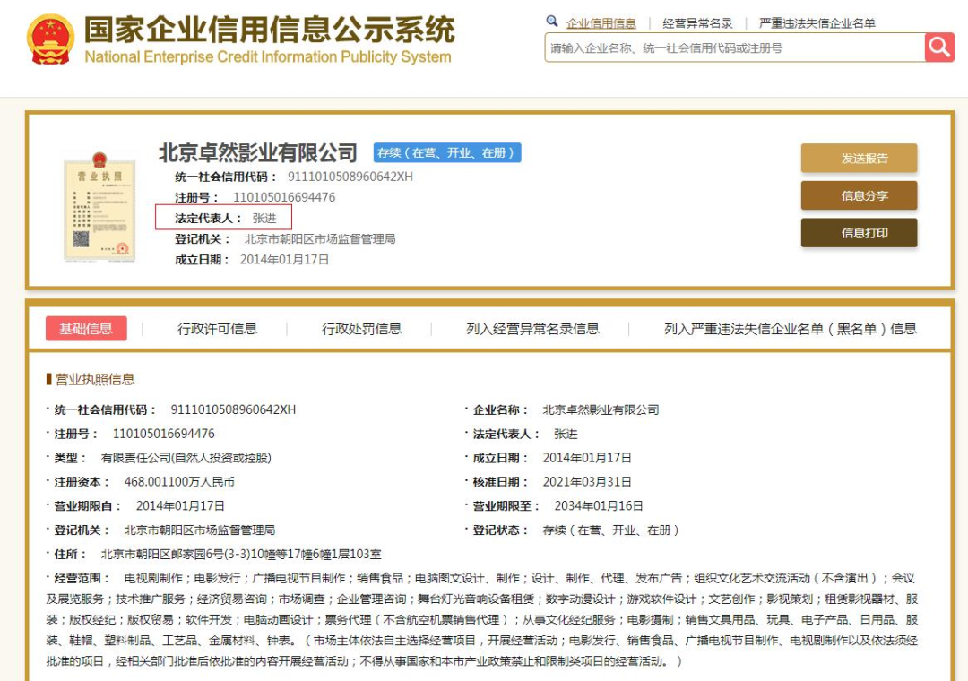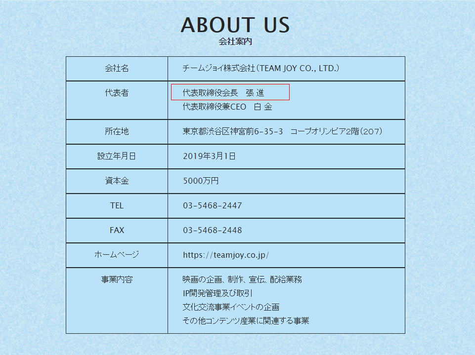 青眼調(diào)查發(fā)現(xiàn),雖然TEAM JOY是日本公司,但是其背后操盤手仍為中國(guó)人。據(jù)《羊城晚報(bào)》此前報(bào)道稱,“TEAM JOY系北京卓然影業(yè)有限公司在日本的子公司!倍鴩(guó)家企業(yè)信用信息公示系統(tǒng)顯示,北京卓然影業(yè)有限公司法定代表人為張進(jìn),根據(jù)TEAM JOY官方網(wǎng)站信息,該公司成立于2019年,代表取締役會(huì)長(zhǎng)(相當(dāng)董事長(zhǎng))正是張進(jìn),該公司主要包含了電影策劃、制作、推廣、發(fā)行業(yè)務(wù),IP開發(fā)管理及交易文化交流業(yè)務(wù)活動(dòng)策劃等內(nèi)容產(chǎn)業(yè)相關(guān)業(yè)務(wù)。不僅如此,在TEAM JOY官網(wǎng)上還顯示有張進(jìn)的照片。