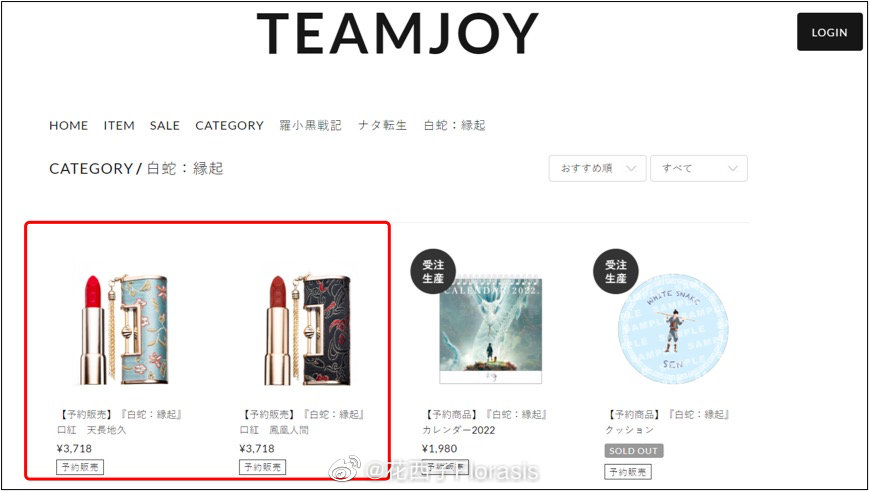 今日上午11時(shí)許,青眼在TEAM JOY網(wǎng)站上看到,上面有2款外觀類似花西子“同心鎖口紅”的口紅正在預(yù)售中,產(chǎn)品名稱即顯示為“白蛇:緣起”口紅,且售價(jià)均為3718日元(約合人民幣208元)。不過,從這2款口紅的外觀和產(chǎn)品介紹,無法判定出自哪個(gè)品牌。除這2款口紅外,TEAM JOY網(wǎng)站上還銷售有多款《白蛇:緣起》IP的周邊產(chǎn)品,包含了手機(jī)扣、小飾品等。