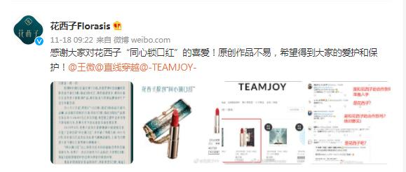 11月18日上午,國(guó)貨美妝品牌花西子在官方微博發(fā)布聲明稱,“追光動(dòng)畫及《白蛇:緣起》日本周邊開發(fā)公司TEAM JOY涉嫌抄襲花西子旗下產(chǎn)品‘同心鎖口紅’”,并呼吁后者停止侵權(quán)行為。