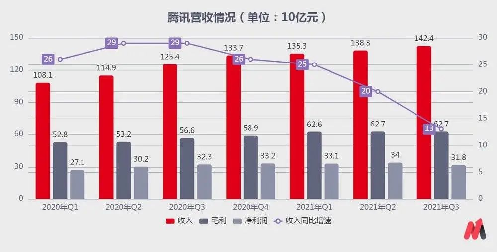 根據(jù)騰訊公布的Q3季報(bào):該季度總營收為1424億元,同比增速進(jìn)一步下降至13%(上個(gè)季度還勉強(qiáng)維持在20%);凈利潤為317.5億元,同比下降2%,由此被很多媒體拿來當(dāng)做標(biāo)題“凈利10年來首次下滑”。