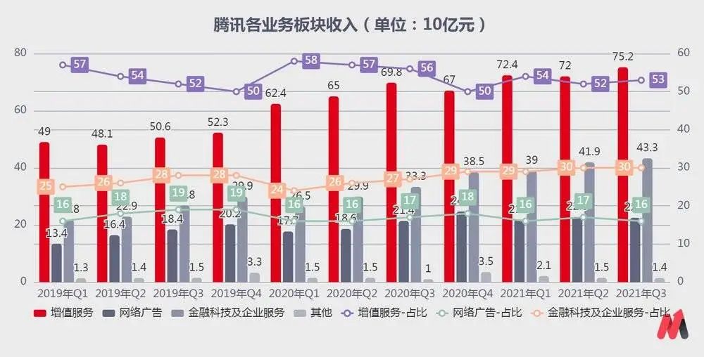 騰訊的營收和利潤來源主要是四塊業(yè)務(wù):增值服務(wù)、網(wǎng)絡(luò)廣告、金融科技及企業(yè)服務(wù)、其他。
