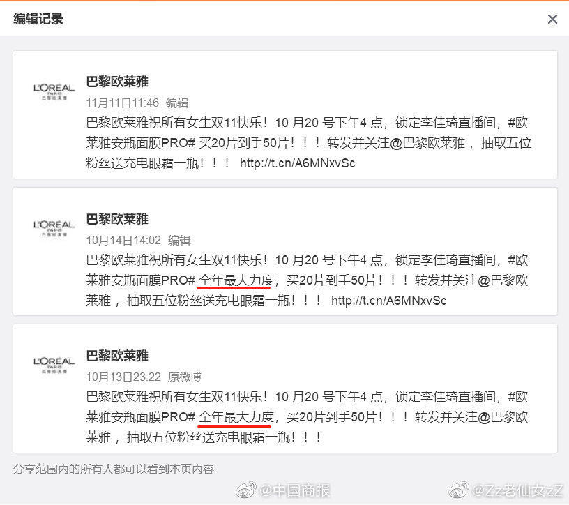 而在雙11預(yù)熱時(shí),巴黎歐萊雅曾發(fā)表過相應(yīng)微博,表示此次活動(dòng)將是全年最大力度的產(chǎn)品優(yōu)惠,鎖定李佳琦直播間。結(jié)果通過滿減券后,同樣產(chǎn)品價(jià)格,在李佳琦直播間購買,比歐萊雅自己店內(nèi)價(jià)格貴出60%多。