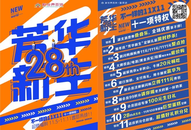 11月,武漢新世界百貨武建設(shè)店以“芳華新生”為主題開(kāi)啟28周年慶生季,恰逢新世界百貨“不一樣的雙11”預(yù)熱期。為致謝陪伴了28載的消費(fèi)者,國(guó)貿(mào)店推出年度超值福利“十一項(xiàng)特權(quán)”。