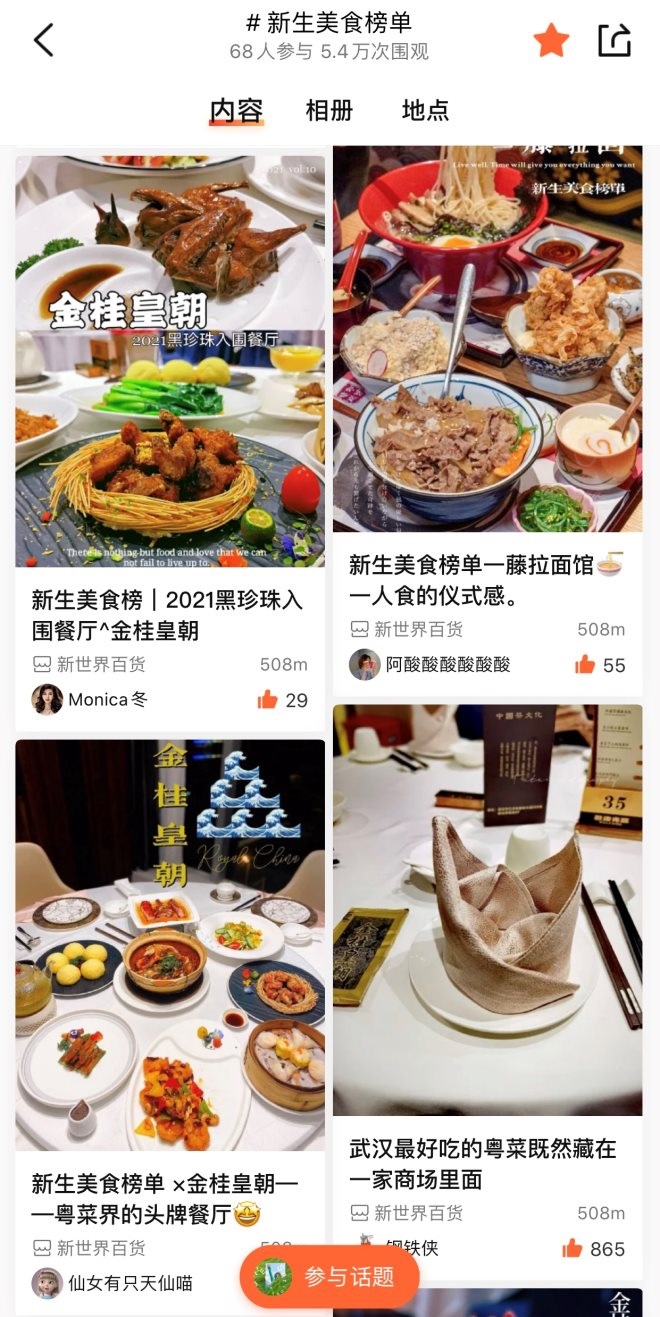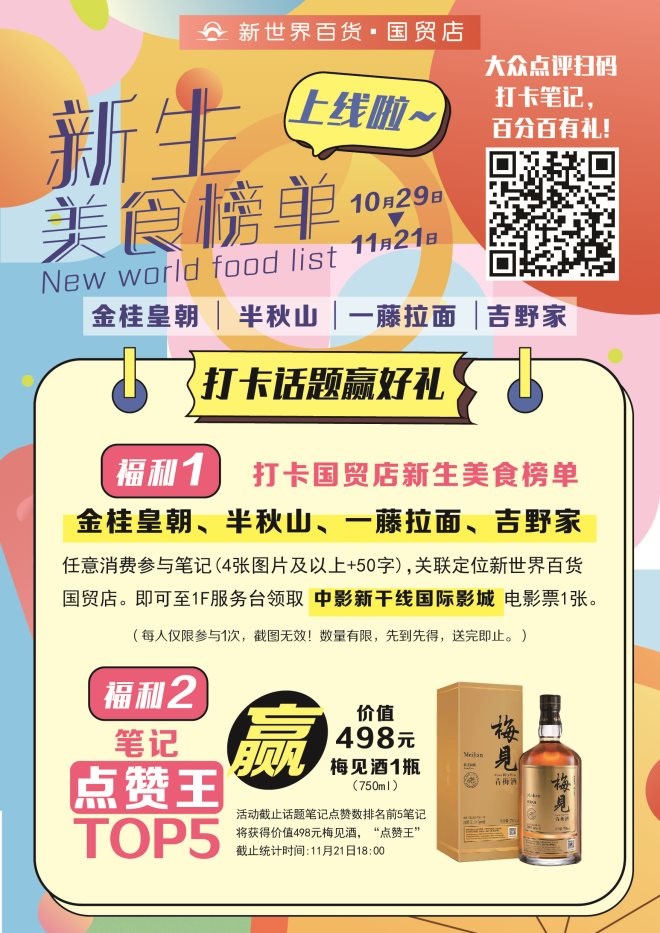 新世界百貨武建設(shè)店先以“搭乘潮流快線,解鎖時(shí)尚消費(fèi)體驗(yàn)”為概念,上線了《下一站,潮就GO了》系列探店類創(chuàng)意營(yíng)銷視頻,并在武漢全線16條地鐵內(nèi)進(jìn)行廣告投放。為更好的助力28周年爆發(fā)期蓄水,實(shí)現(xiàn)流量轉(zhuǎn)化的閉環(huán),10月29日起,武建設(shè)店在大眾點(diǎn)評(píng)平臺(tái)發(fā)起“新生美食榜單”話題征集,召集了武漢當(dāng)?shù)囟辔幻朗愁怟OL、筆記大咖空降武建設(shè)店,對(duì)榜單內(nèi)人氣餐飲,如金桂皇朝、半秋山、一藤拉面等進(jìn)行推薦打卡,向社群及圈層消費(fèi)者分享探店體驗(yàn),促進(jìn)消費(fèi)引流、激活美食品類消費(fèi)圈層,從而吸引客流到店。