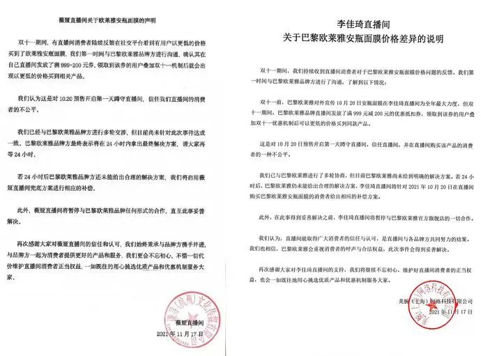 這一下得罪了兩個頭部主播,李佳琦、薇婭紛紛發(fā)出聲明,一個表示暫停與巴黎歐萊雅旗艦店的合作,一個表示暫停與巴黎歐萊雅品牌任何形式的合作。