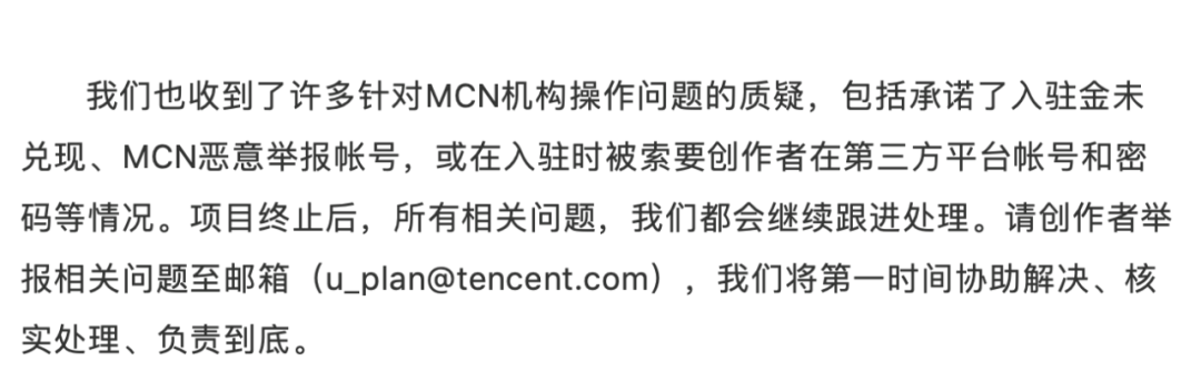 在承諾平臺方不會侵害創(chuàng)作者權(quán)益之外,針對“MCN承諾了入駐金未兌現(xiàn)”、“MCN惡意舉報帳號”,或“創(chuàng)作者在入駐時被索要創(chuàng)作者在第三方平臺帳號和密碼”等情況,騰訊方面表示,將跟進處理相關(guān)問題,創(chuàng)作者如有問題可向騰訊舉報。