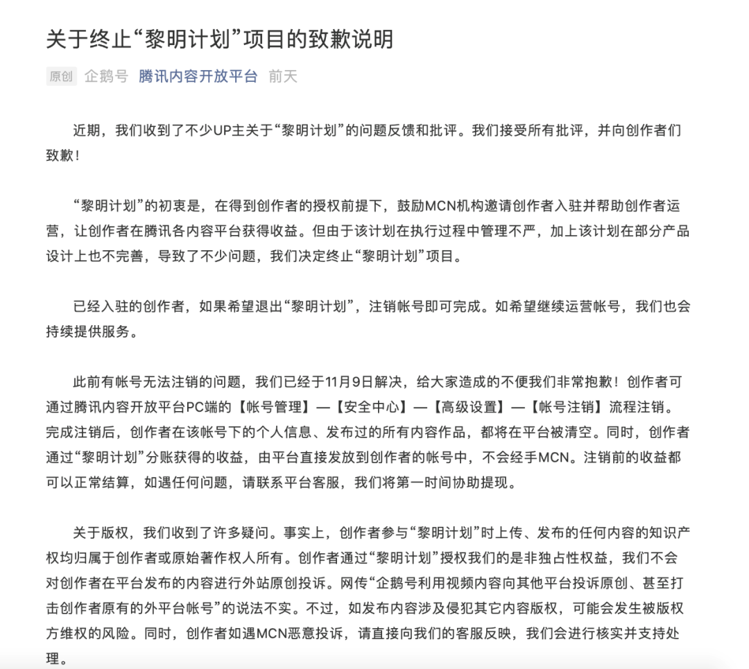 11月17日,騰訊官方發(fā)布致歉說明,宣布終止企鵝號黎明計劃。