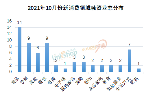 從業(yè)態(tài)來看,食品、飲料依然是主流,10月份分別發(fā)生14起、9起融資事件。緊隨其后的是餐飲(9起)、生活方式(7起)和美妝(6起)。