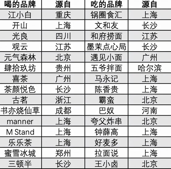 我在今年藍鯊消費評選的餐飲獨角獸中,“餐”和“飲”各挑了15家,來自北京的品牌只有元氣森林、霸蠻牛肉粉和夸父炸串,反觀上海和長沙,幾乎占了這30個品牌的半壁江山,是新消費最靚的仔。