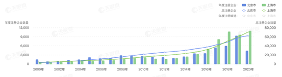 在最近二十年新注冊餐飲企業(yè)的數(shù)據(jù)上,也可以很明顯地看出在2016年以前,北京相比于上海優(yōu)勢。而到了2016年,上海首次以較大比例反超北京,此后則一直保持對北京的領先,2020年更是領先北京一倍有余,總注冊企業(yè)數(shù)量上,上海2018年也超過北京。