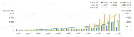 如果這個數(shù)據(jù)再加上新晉的“吃貨”網(wǎng)紅城市長沙,對比則更為明顯。從下圖可以看出在2012年以前,長沙的新注冊企業(yè)數(shù)與上海和北京還無法抗衡,但到了2013年以后,則持續(xù)大幅度碾壓北、上這兩個超一線城市。