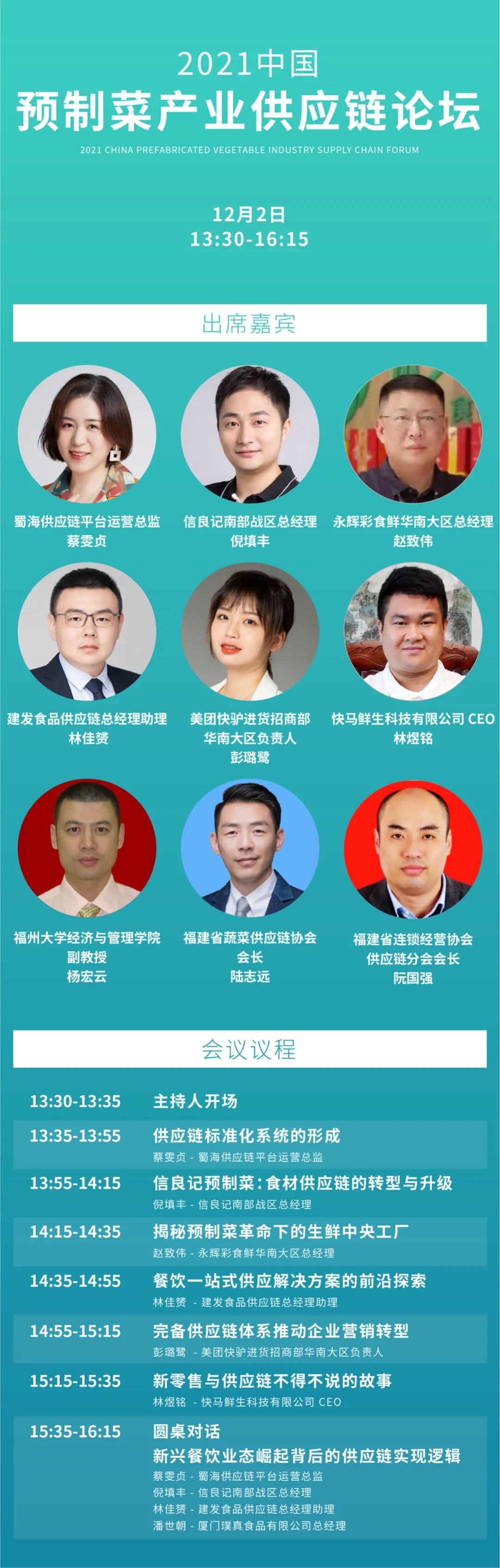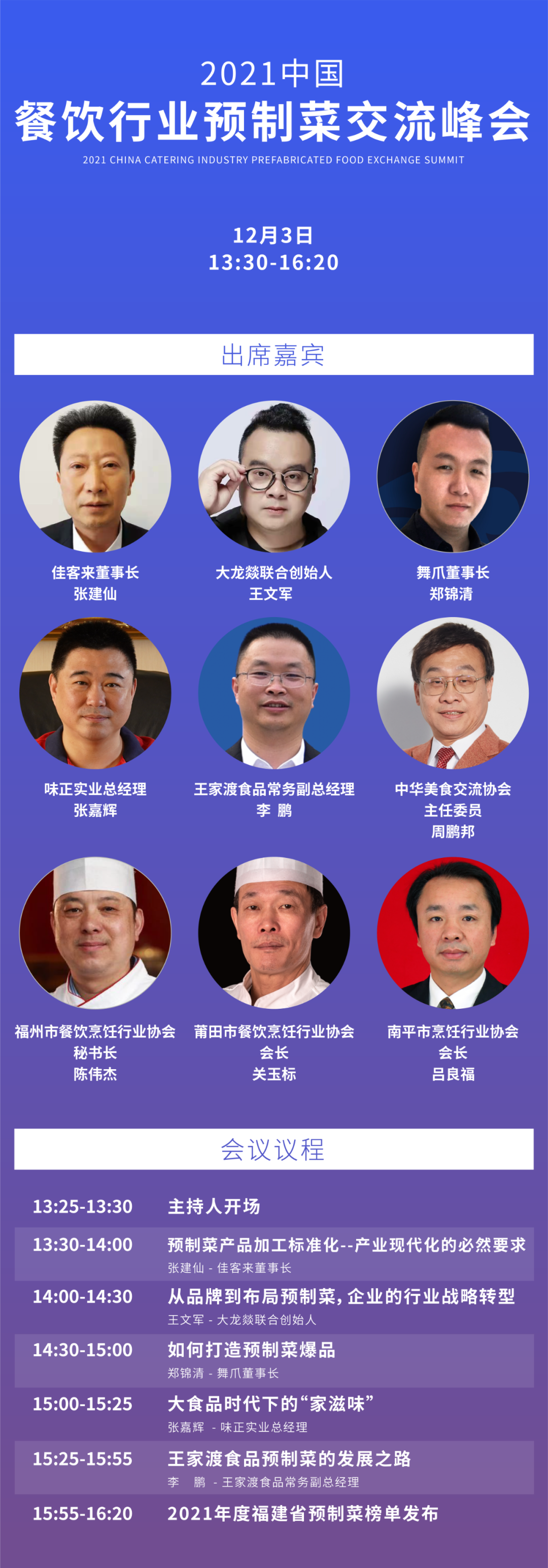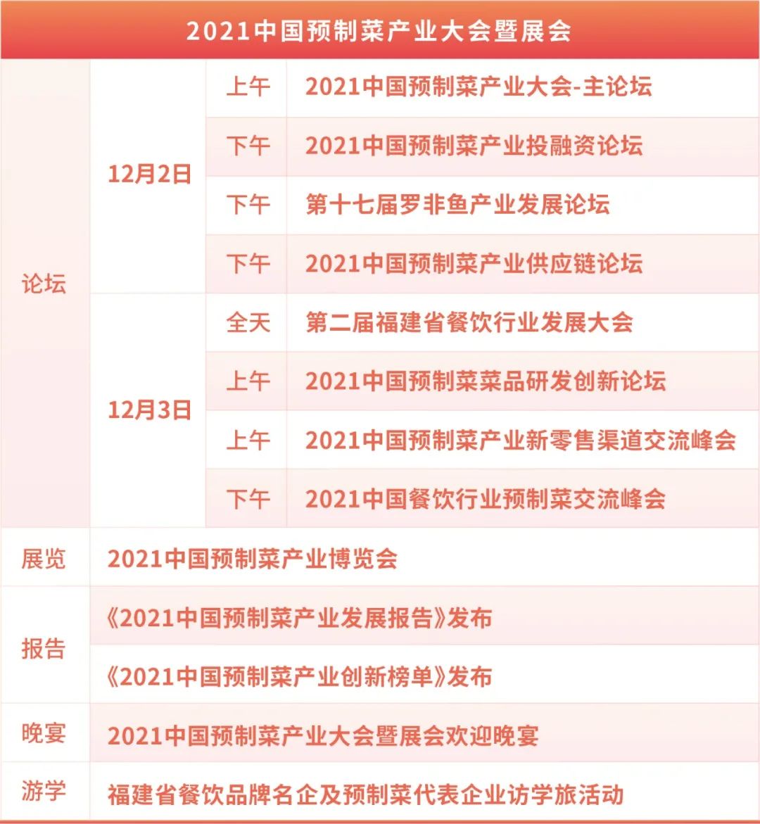 為了助力企業(yè)搶抓預制菜產業(yè)風口,2021中國預制菜產業(yè)大會共開展1場主論壇,7個專題創(chuàng)新論壇和4個同期配套活動,分別為大會主論壇、2021中國預制菜產業(yè)投融資論壇、第十七屆羅非魚產業(yè)發(fā)展論壇、2021中國預制菜產業(yè)供應鏈論壇、第二屆福建省餐飲行業(yè)發(fā)展大會、2021中國預制菜菜品研發(fā)創(chuàng)新論壇、2021中國預制菜產業(yè)新零售渠道交流峰會、2021中國餐飲行業(yè)預制菜交流峰會 、2021中國預制菜產業(yè)大會暨展會歡迎晚宴、《2021中國預制菜產業(yè)發(fā)展報告》發(fā)布、《2021中國預制菜產業(yè)創(chuàng)新榜單》發(fā)布、福建省餐飲品牌名企及預制菜代表企業(yè)訪學旅活動等。
