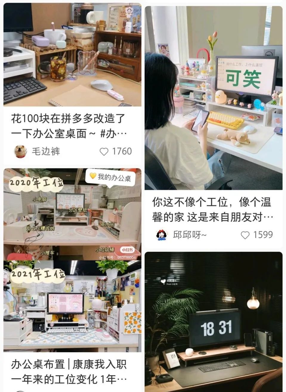 第三類:美學(xué)類。作為“摸魚經(jīng)濟”的最高級形態(tài),摸魚美學(xué)已融入了年輕人的日常生活中。以工位為例。“桌搭“又被稱為“桌面搭配”,是摸魚美學(xué)江湖的重要流派。從桌墊、杯墊再到鼠標墊,從水杯、手辦到小家電,季節(jié)不同,工位的色系也不同。作為打工人的另一個“家”,工位成了消費主義的另一大戰(zhàn)場。