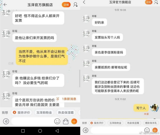 在玉澤的發(fā)票門中,玉澤的店鋪?zhàn)圆?yōu)惠力度比李佳琦直播間更大。大量網(wǎng)友氣不過玉澤對(duì)李佳琦的“忘恩負(fù)義”,紛紛去找玉澤淘寶旗艦店開發(fā)票。品牌與主播的關(guān)系竟然“言情化”了,故事情節(jié)活像秀才高中意欲拋棄糟糠妻。