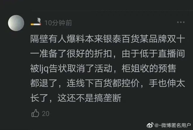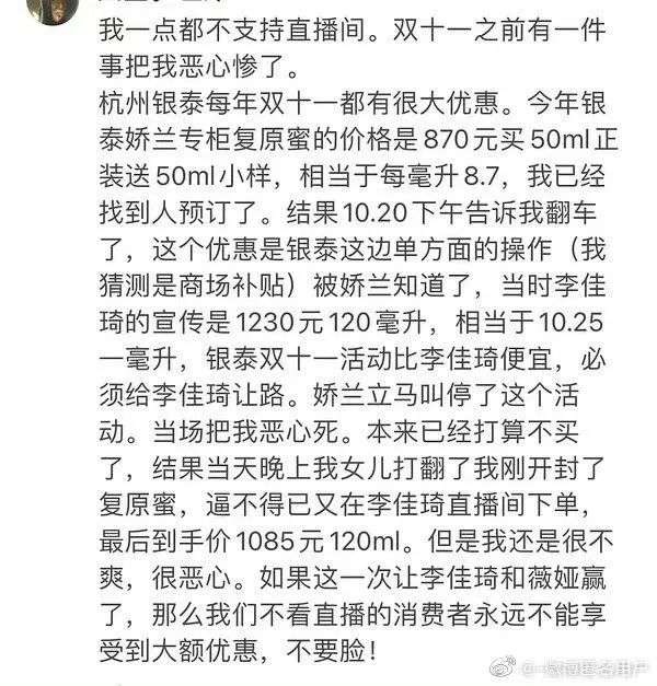 但就在歐萊雅道歉的當(dāng)天,兩則“天下苦直播久矣”的投稿在微博上流傳開來,直指主播的“手也伸太長了”、“搞壟斷”。該微博如今轉(zhuǎn)發(fā)已近5萬。