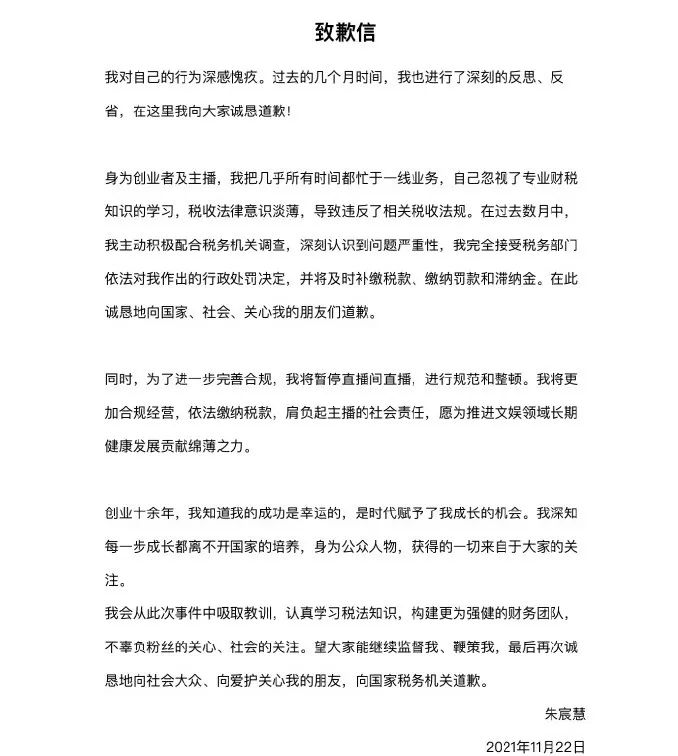當(dāng)晚,雪梨、林珊珊就“偷逃稅被處罰”一事發(fā)表致歉信,并表示將暫停直播間直播,進(jìn)行規(guī)范和整頓,依法繳納罰款。