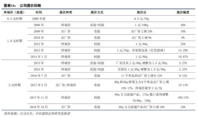 中信建投證券曾在2020年4月發(fā)布的研報中進行了統(tǒng)計,2008年至2018年10月,涪陵榨菜已累計提價12次,主要形式包括直接提價(提出廠價或終端價)和間接提價(價格不變,縮小規(guī)格)。