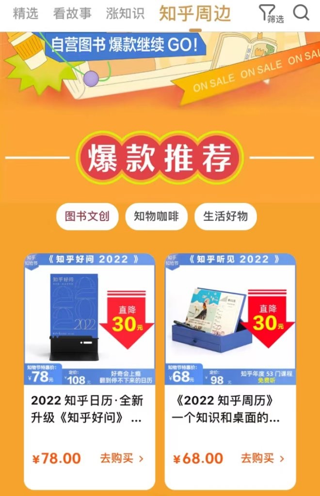在知乎APP上,目前關(guān)于自營電商業(yè)務(wù)并沒有一個明確清晰的入口。其中一條搜索路徑,是可以在會員一欄中的知乎周邊,看到爆款推薦,產(chǎn)品包括圖書文創(chuàng)、知乎自有咖啡和生活好物三個分類。