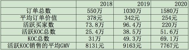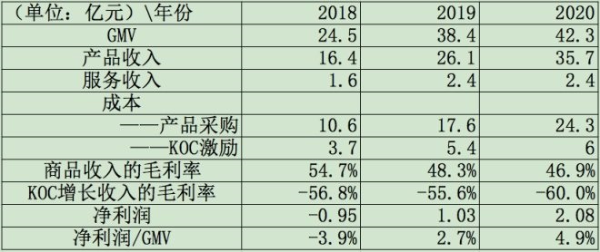 這是一個類似于金字塔的營銷加盟模式,但是層級僅限兩層,并且有銷售實(shí)物,使其避免了更大的法律風(fēng)險(xiǎn)。從洋蔥的KOC激勵費(fèi)用倒退計(jì)算,2020年其KOC激勵支出6億元,對應(yīng)著40億元從KOC渠道銷售的商品交易額,占據(jù)了洋蔥整體GMV的約95%,這意味著洋蔥的自然流量獲取基本可視為“零”,KOC帶貨效用非常顯著。