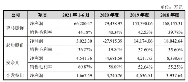 不過在賺錢能力方面,衣拉拉卻展現(xiàn)出了不同的一面:較低的毛利率以及較高的凈利率。招股書顯示,2018-2021年上半年,衣拉拉毛利率分別為37.84%、38.09%、40.88%和39.52%,同期的森馬服飾、安奈兒、起步股份、金發(fā)拉比童裝業(yè)務的毛利率分別為42.44%、56.53%、24.20%、59.99%。最近3年,衣拉拉的凈利率分別為18.69%、21.66%、23.32%,同樣拿森馬服飾、安奈兒、起步股份、金發(fā)拉比對比,凈利率分別為5.22%、-3.72%、-36.10%、10.35%。