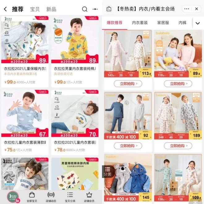 實際上,在銷售端,也能看到衣拉拉的低價策略。「電商在線」從衣拉拉天貓旗艦店和巴拉巴拉天貓旗艦店對比發(fā)現(xiàn),同樣的兒童純棉內衣套裝,衣拉拉價格均不足百元一套,其他品牌大多會有不同材質款式和價格的分級。