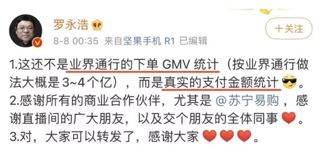 但羅永浩是個(gè)特例。按照他本人的說法,他直播間的官方戰(zhàn)報(bào)是按照真實(shí)的支付金額計(jì)算GMV,即支付GMV,是指從下單GMV中刨去“未付款”部分。